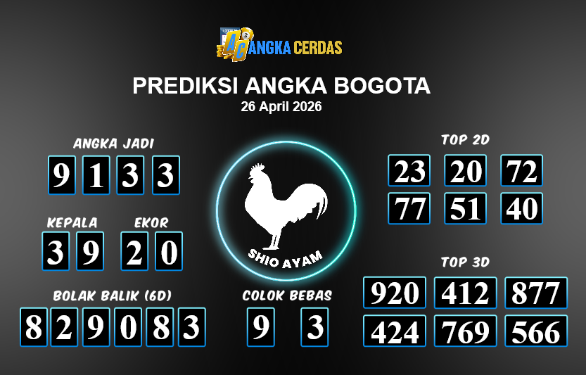 Prediksi Togel BOGOTA untuk hari ini Minggu, 26 April 2026, adalah salahsatu jenis togel yang memiliki banyak penggemar.Ini terutama ditujukanbagi Anda yang menyukai 4d/3d/2d. Prediksi Angka Cerdas yang kamisediakan,bisa