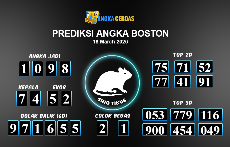 Prediksi Togel BOSTON untuk hari ini Rabu, 18 Maret 2026, adalah salah