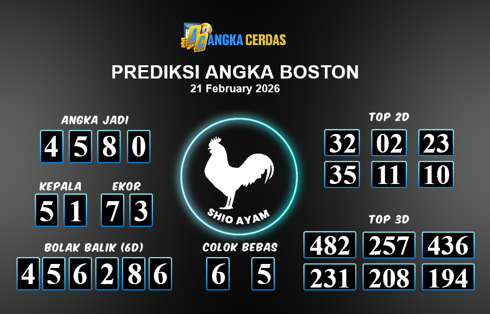 Prediksi Togel BOSTON untuk hari ini Sabtu,, 21 Februari 2026, adalah salah