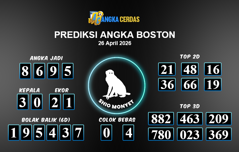 Prediksi Togel BOSTON untuk hari ini Minggu, 26 April 2026, adalah salahsatu jenis togel yang memiliki banyak penggemar.Ini terutama ditujukanbagi Anda yang menyukai 4d/3d/2d. Prediksi Angka Cerdas yang kamisediakan,bisa