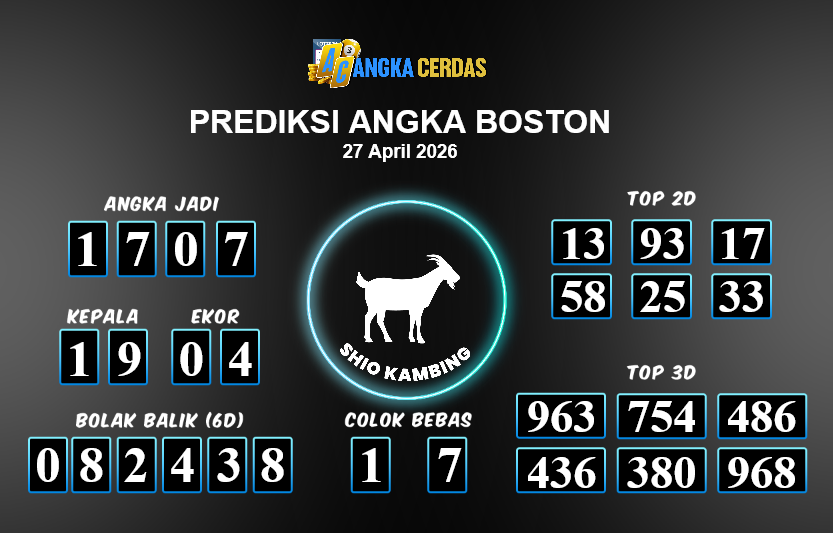 Prediksi Togel BOSTON untuk hari ini Senin, 27 April 2026, adalah salahsatu jenis togel yang memiliki banyak penggemar.Ini terutama ditujukanbagi Anda yang menyukai 4d/3d/2d. Prediksi Angka Cerdas yang kamisediakan,bisa