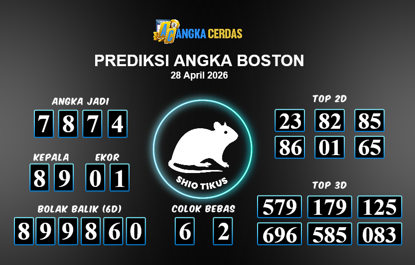 Prediksi Togel BOSTON untuk hari ini Selasa, 28 April 2026, adalah salahsatu jenis togel yang memiliki banyak penggemar.Ini terutama ditujukanbagi Anda yang menyukai 4d/3d/2d. Prediksi Angka Cerdas yang kamisediakan,bisa