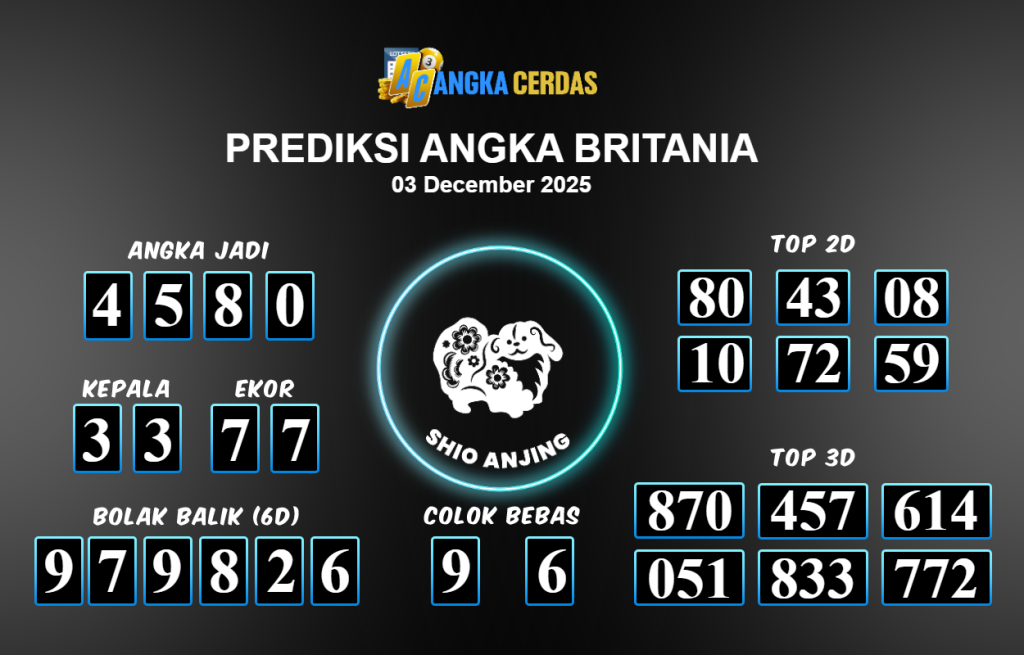 Prediksi Togel BRITANIA untuk hari ini Rabu 03 Desember November 2025, adalah salah