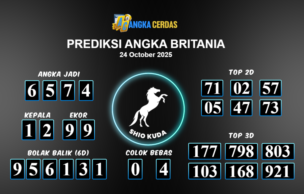 Prediksi Togel BRITANIA untuk hari ini Jumat 24 Oktober 2025, adalah salah