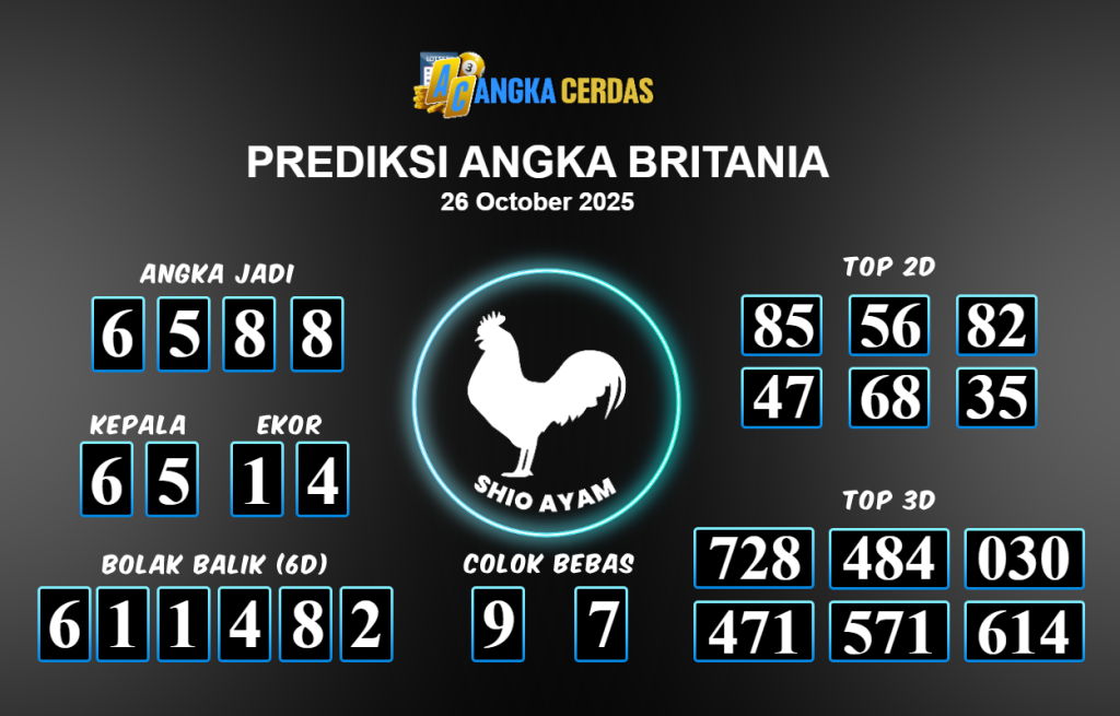 Prediksi Togel BRITANIA untuk hari ini Minggu 26 Oktober 2025, adalah salah