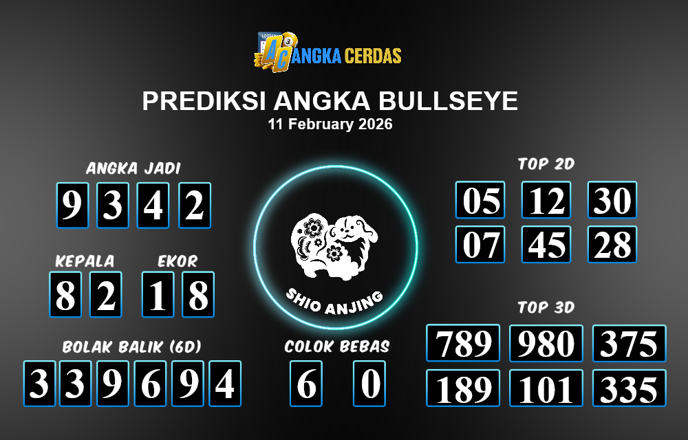 Prediksi Togel BULLSEYE untuk hari ini Rabu, 11 Februari 2026, adalah salah