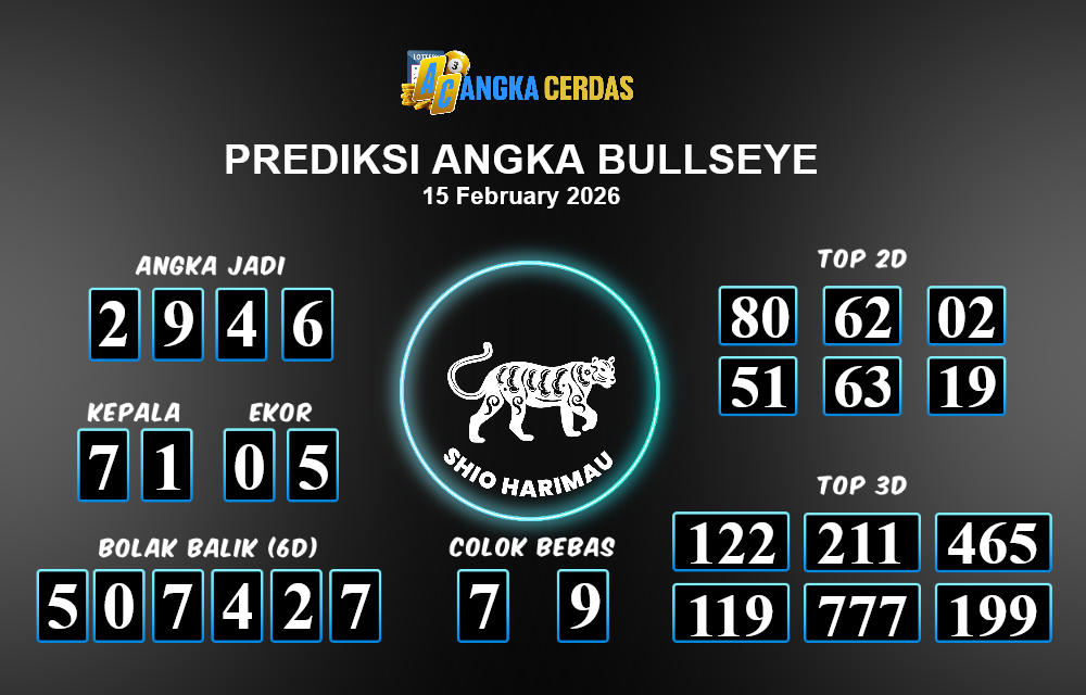 Prediksi Togel BULLSEYE untuk hari ini Minggu, 15 Februari 2026, adalah salah