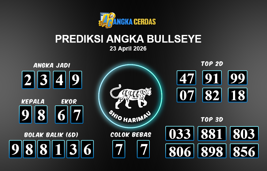 Prediksi Togel BULLSEYE untuk hari ini Kamis, 23 April 2026, adalah salahsatu jenis togel yang memiliki banyak penggemar.Ini terutama ditujukanbagi Anda yang menyukai 4d/3d/2d. Prediksi Angka Cerdas yang kamisediakan,bisa