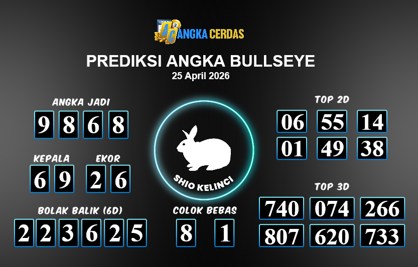 Prediksi Togel BULLSEYE untuk hari ini Sabtu, 25 April 2026, adalah salahsatu jenis togel yang memiliki banyak penggemar.Ini terutama ditujukanbagi Anda yang menyukai 4d/3d/2d. Prediksi Angka Cerdas yang kamisediakan,bisa