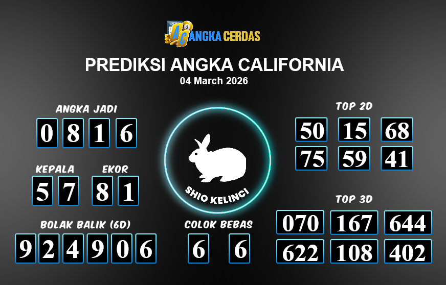 Angka Cerdas : Bocoran Prediksi Togel CALIFORNIA Tanggal 04 MARET 2026