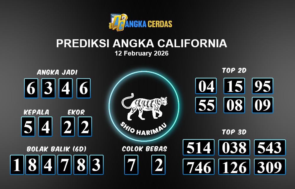 Prediksi Togel CALIFORNIA untuk hari ini Kamis, 12 Februari 2026, adalah salah