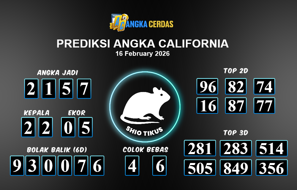 Prediksi Togel CALIFORNIA untuk hari ini Senin, 16 Februari 2026, adalah salah