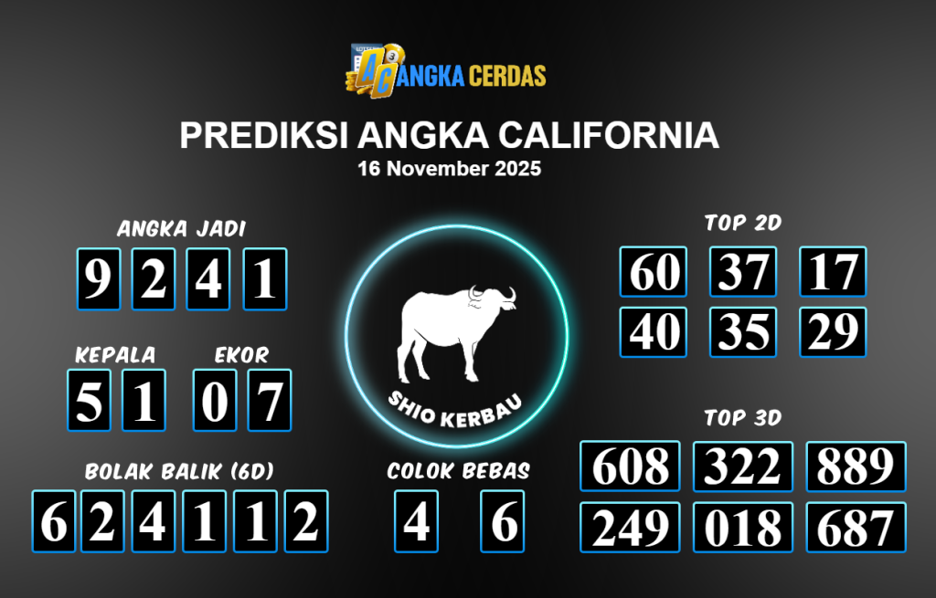 Prediksi Togel CALIFORNIA untuk hari ini Minggu 16 November 2025, adalah salah