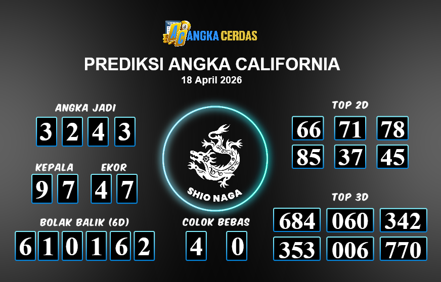Prediksi Togel CALIFORNIA untuk hari ini Sabtu, 18 April 2026, adalah salahsatu jenis togel yang memiliki banyak penggemar.Ini terutama ditujukanbagi Anda yang menyukai 4d/3d/2d. Prediksi Angka Cerdas yang kamisediakan,bisa