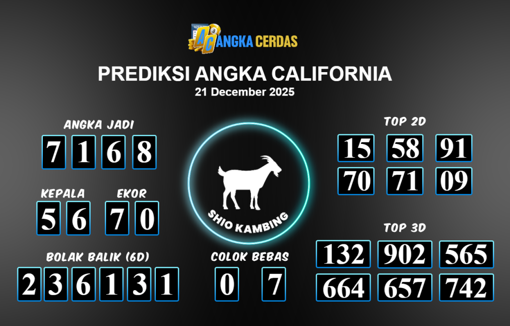Prediksi Togel CALIFORNIA untuk hari ini Minggu 21 Desember November 2025, adalah salah