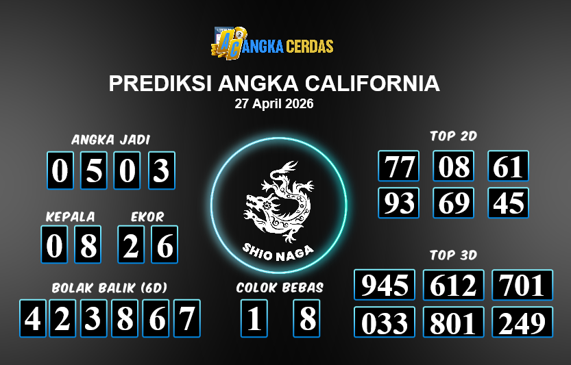 Prediksi Togel CALIFORNIA untuk hari ini Senin, 27 April 2026, adalah salahsatu jenis togel yang memiliki banyak penggemar.Ini terutama ditujukanbagi Anda yang menyukai 4d/3d/2d. Prediksi Angka Cerdas yang kamisediakan,bisa