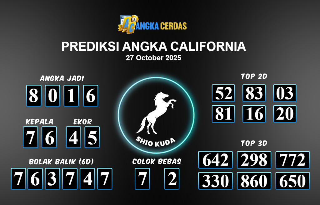 Prediksi Togel CALIFORNIA untuk hari ini Senin 27 Oktober 2025, adalah salah