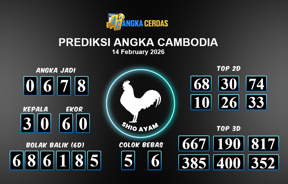 Prediksi Togel CAMBODIA untuk hari ini Sabtu, 14 Februari 2026, adalah salah