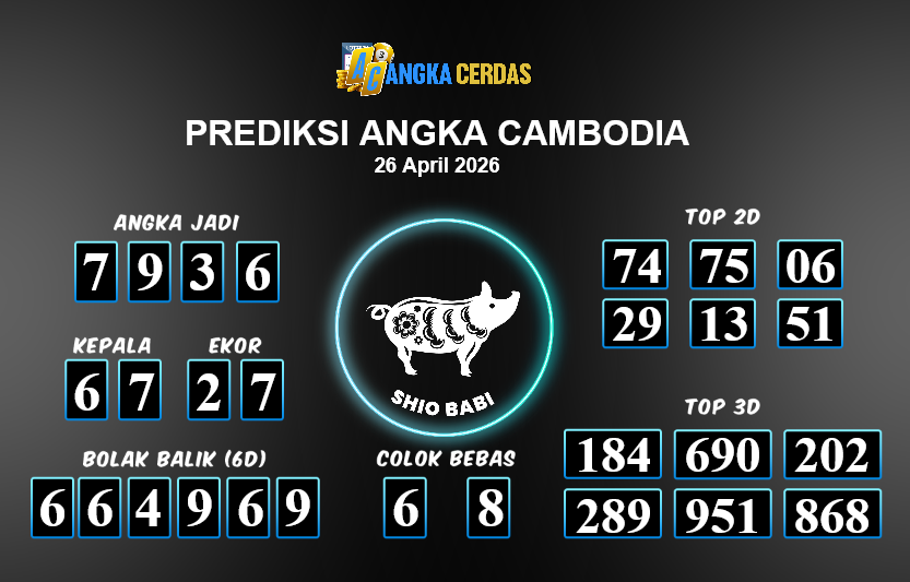 Prediksi Togel CAMBODIA untuk hari ini Minggu, 26 April 2026, adalah salahsatu jenis togel yang memiliki banyak penggemar.Ini terutama ditujukanbagi Anda yang menyukai 4d/3d/2d. Prediksi Angka Cerdas yang kamisediakan,bisa