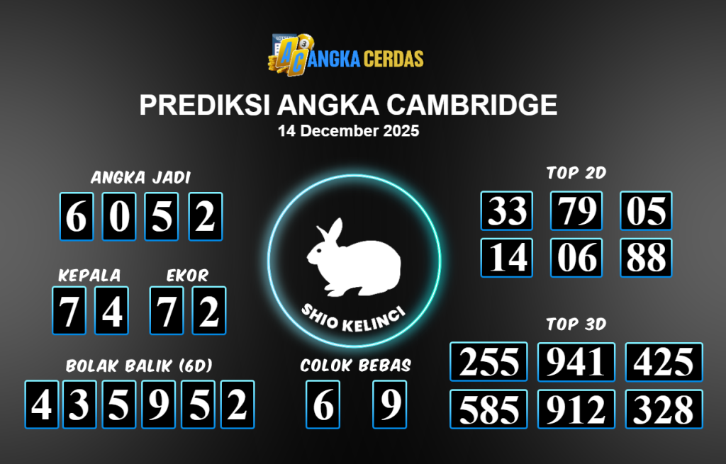 Prediksi Togel CAMBRIDGE untuk hari ini Minggu 14 Desember November 2025, adalah salah