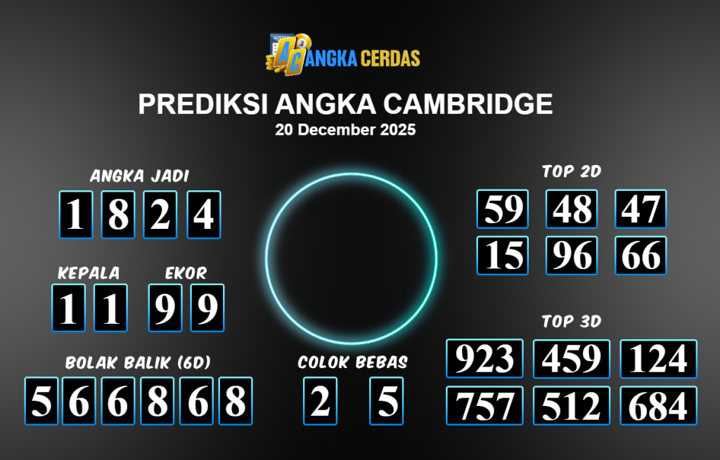 Prediksi Togel CAMBRIDGE untuk hari ini Sabtu 20 Desember November 2025, adalah salah