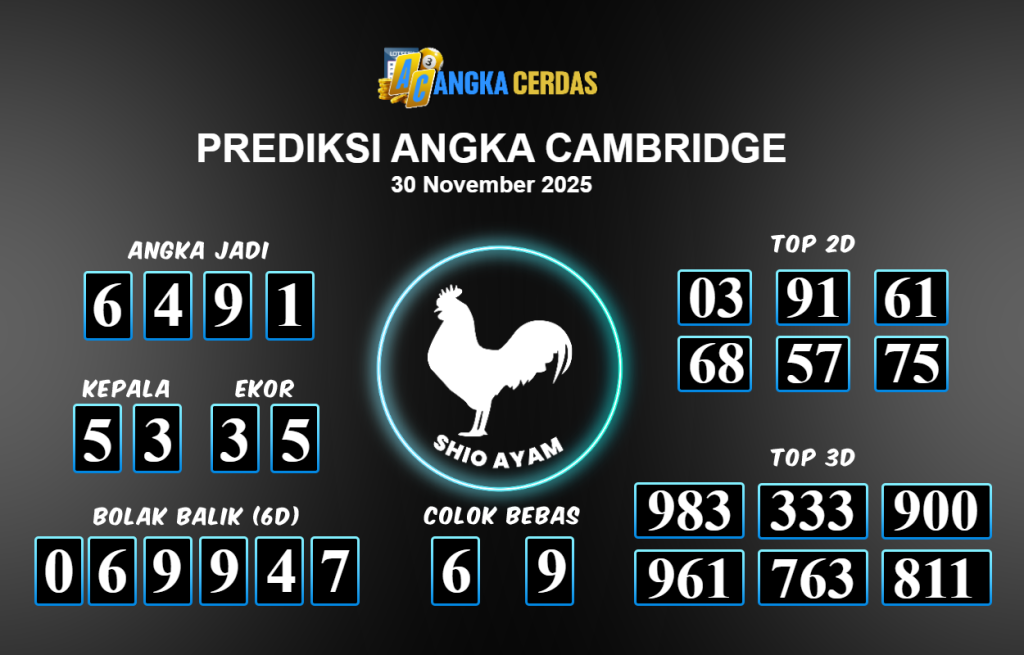 Prediksi Togel CAMBRIDGE untuk hari ini Minggu 30 November 2025, adalah salah