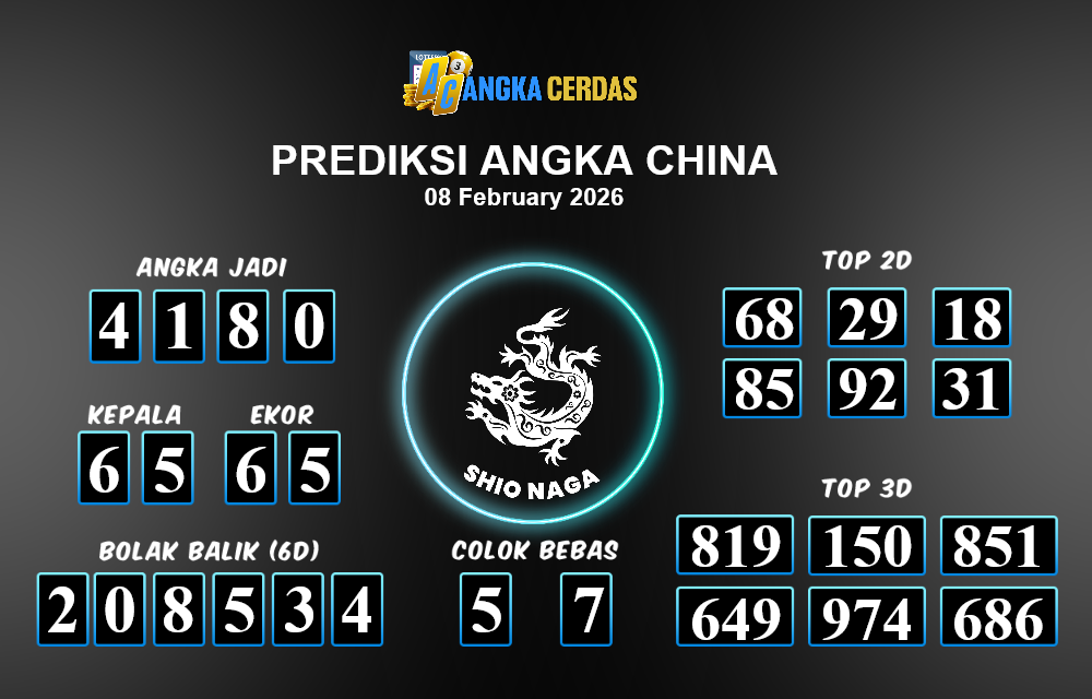 Prediksi Togel CHINA untuk hari ini Minggu, 08 Februari 2026, adalah salah