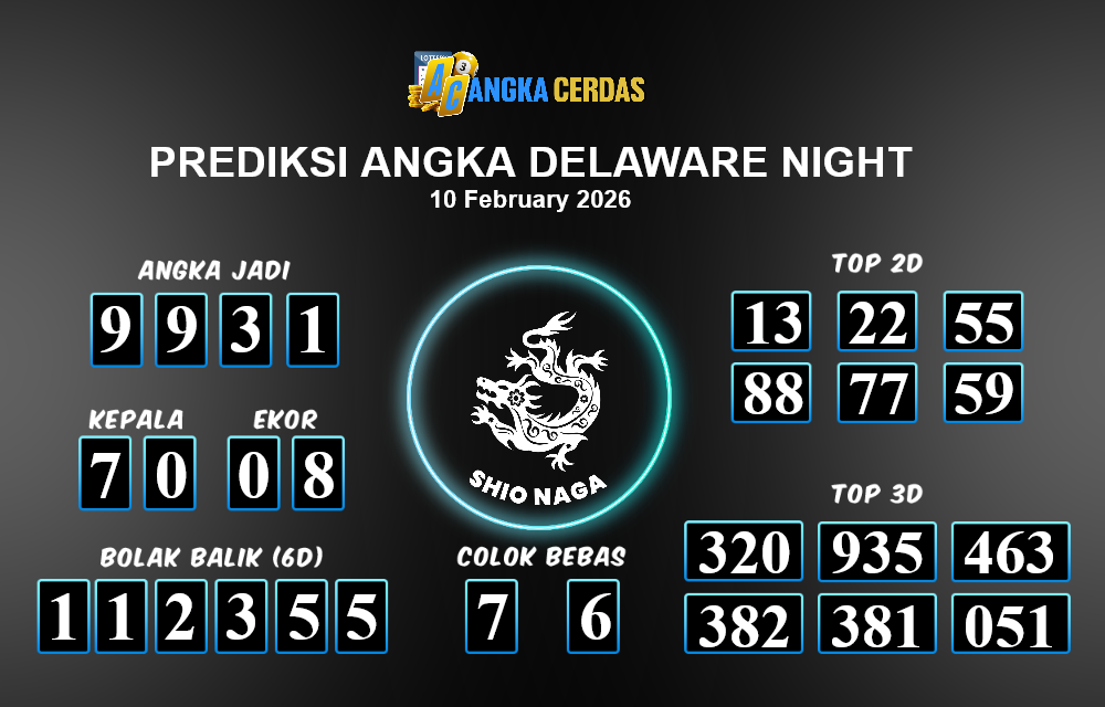 Prediksi Togel DELAWARE NIGHT untuk hari ini Selasa, 10 Februari 2026, adalah salah