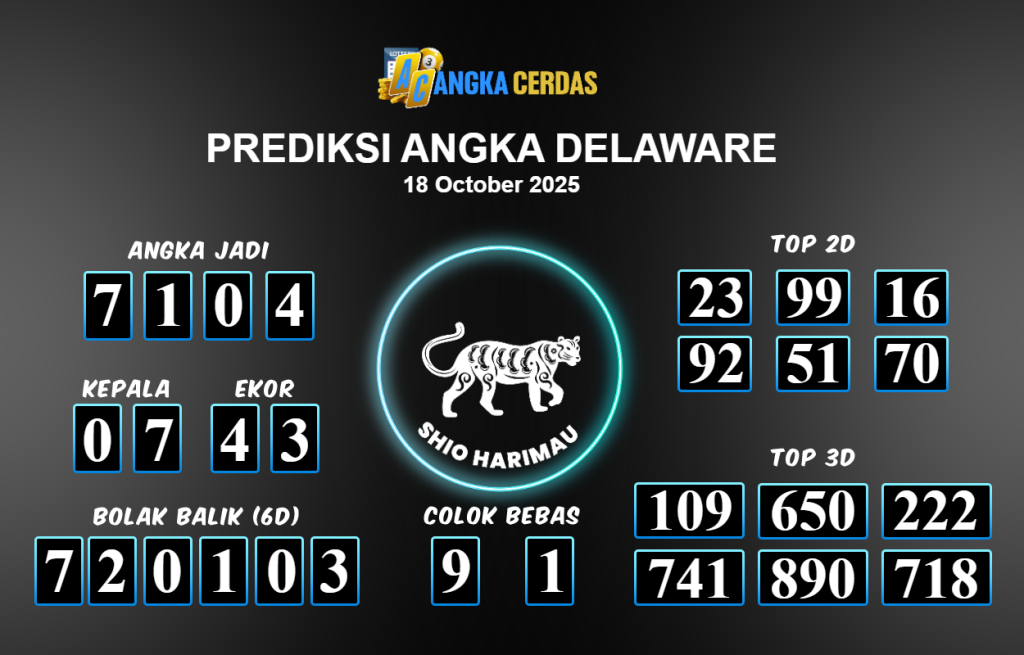 Prediksi Togel DELAWARE untuk hari ini Sabtu 18 Oktober 2025, adalah salah