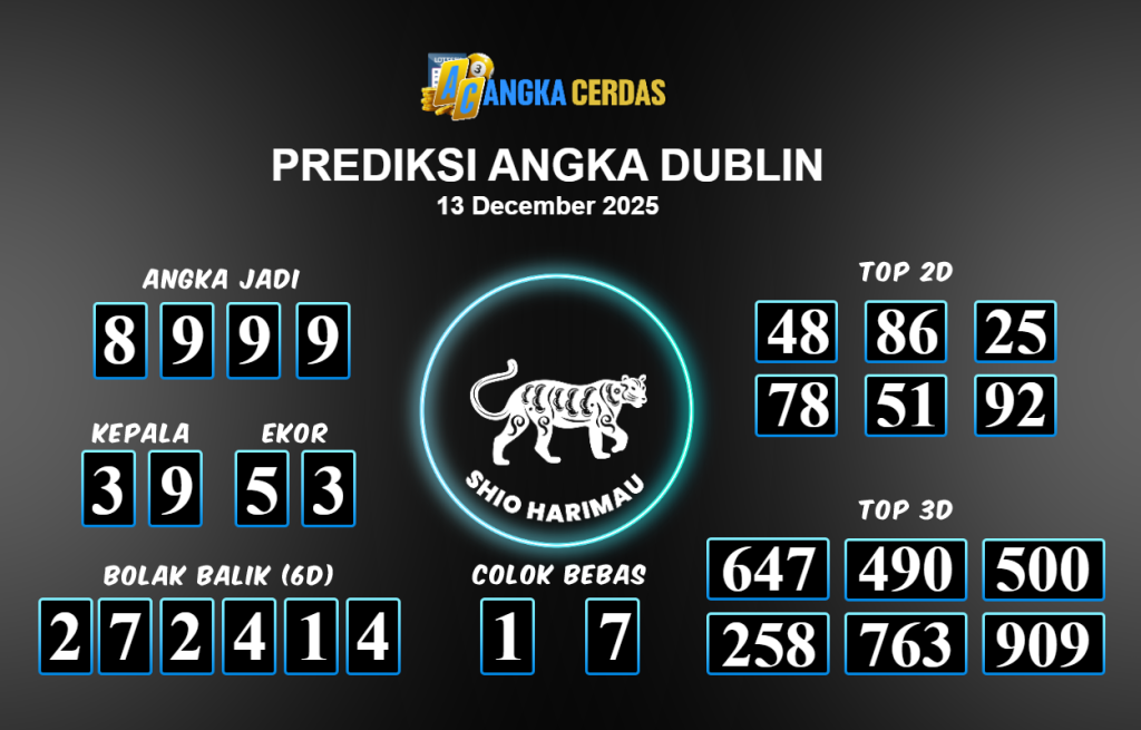 Prediksi Togel DUBLIN untuk hari ini Sabtu 13 Desember November 2025, adalah salah