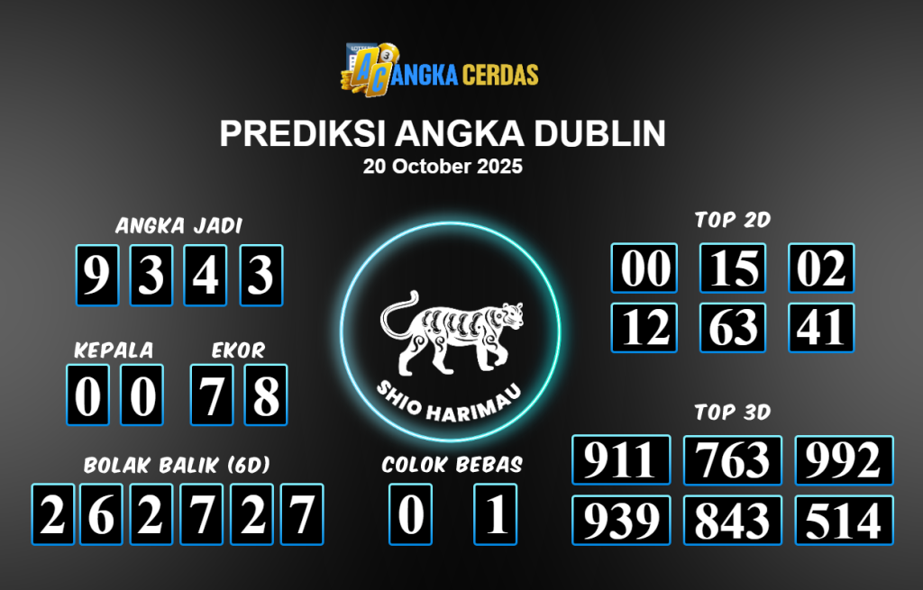 Prediksi Togel DUBLIN untuk hari ini Senin 20 Oktober 2025, adalah salah