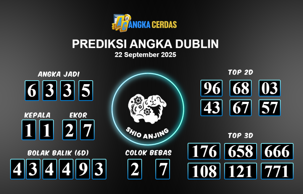 Prediksi Togel DUBLIN untuk hari ini Senin 22 September 2025, adalah salah