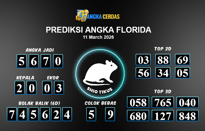 Prediksi Togel FLORIDA untuk hari ini Rabu, 11 Maret 2026, adalah salah