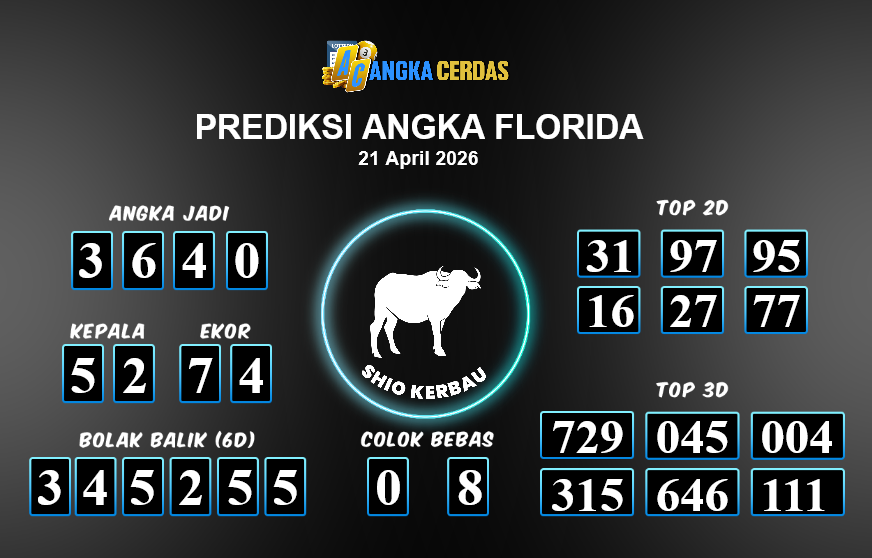 Prediksi Togel FLORIDA untuk hari ini Selasa, 21 April 2026, adalah salahsatu jenis togel yang memiliki banyak penggemar.Ini terutama ditujukanbagi Anda yang menyukai 4d/3d/2d. Prediksi Angka Cerdas yang kamisediakan,bisa
