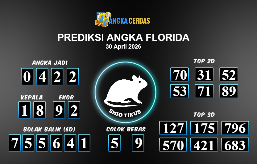 Prediksi Togel FLORIDA untuk hari ini Kamis, 30 April 2026, adalah salahsatu jenis togel yang memiliki banyak penggemar.Ini terutama ditujukanbagi Anda yang menyukai 4d/3d/2d. Prediksi Angka Cerdas yang kamisediakan,bisa