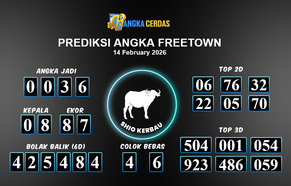 Prediksi Togel FREETOWN untuk hari ini Sabtu, 14 Februari 2026, adalah salah