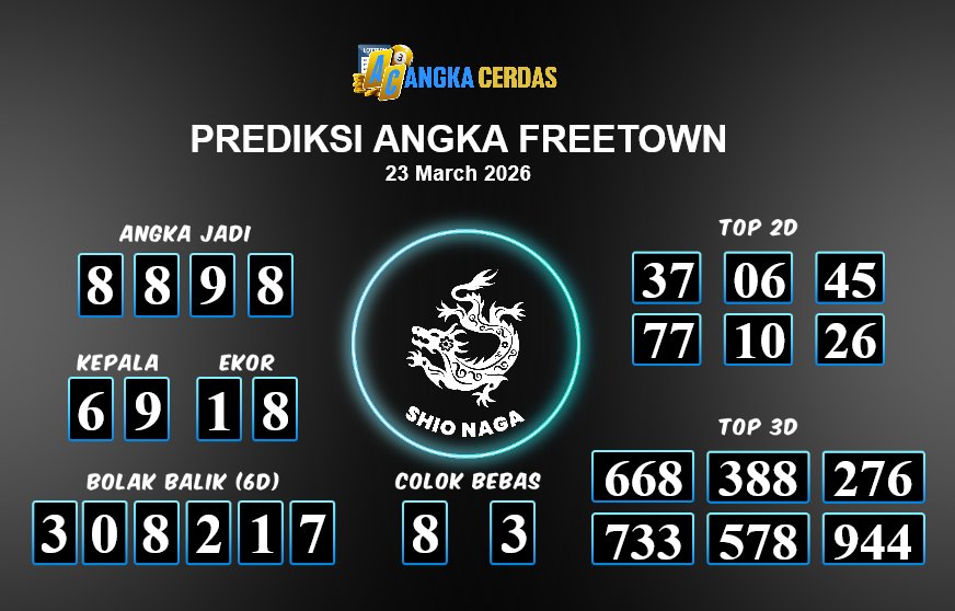 Prediksi Togel FREETOWN untuk hari ini Senin, 23 Maret 2026, adalah salah