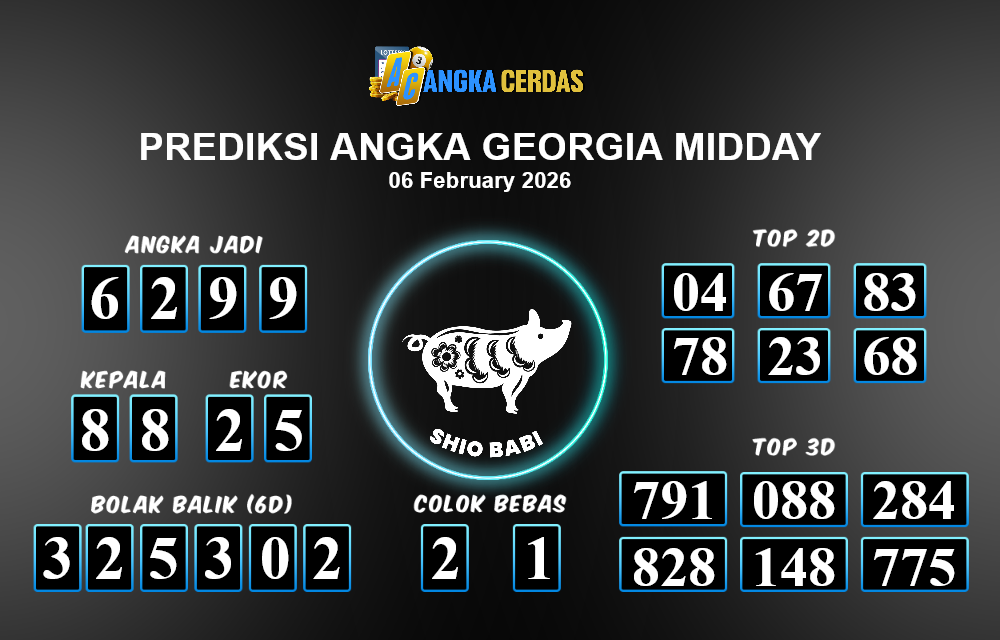 Prediksi Togel GEORGIA MIDDAY untuk hari ini Jumat, 06 Februari 2026, adalah salah