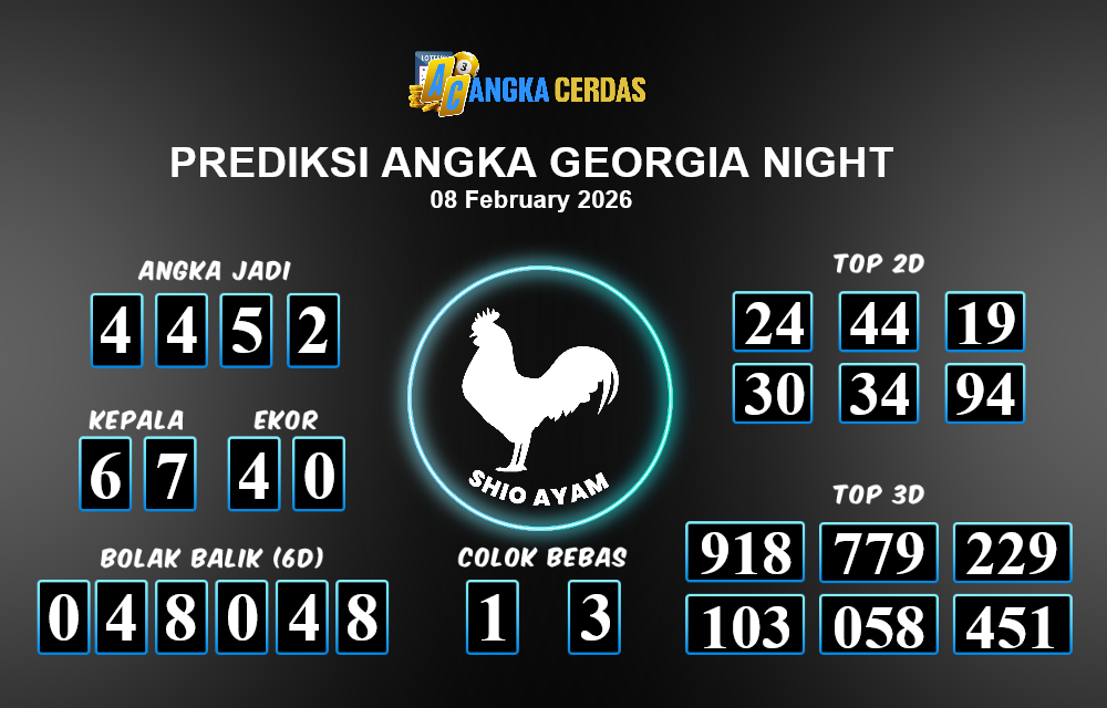 Prediksi Togel GEORGIA NIGHT untuk hari ini Minggu, 08 Februari 2026, adalah salah
