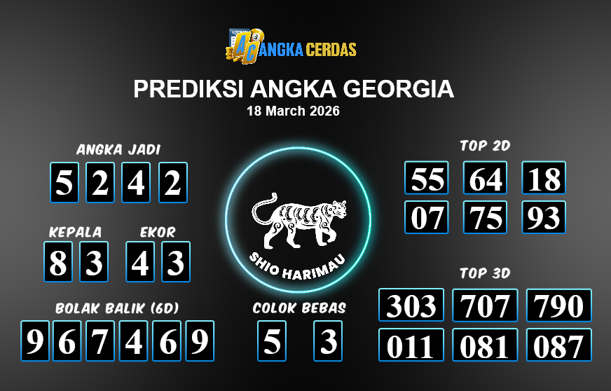 Prediksi Togel GEORGIA untuk hari ini Rabu, 18 Maret 2026, adalah salah