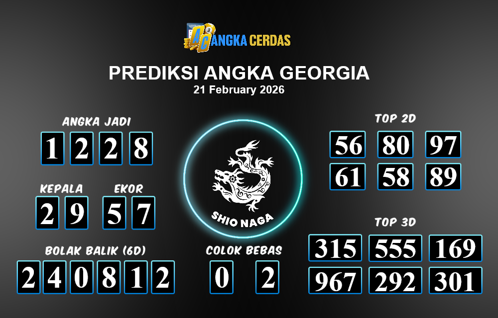Prediksi Togel GEORGIA untuk hari ini Sabtu,, 21 Februari 2026, adalah salah