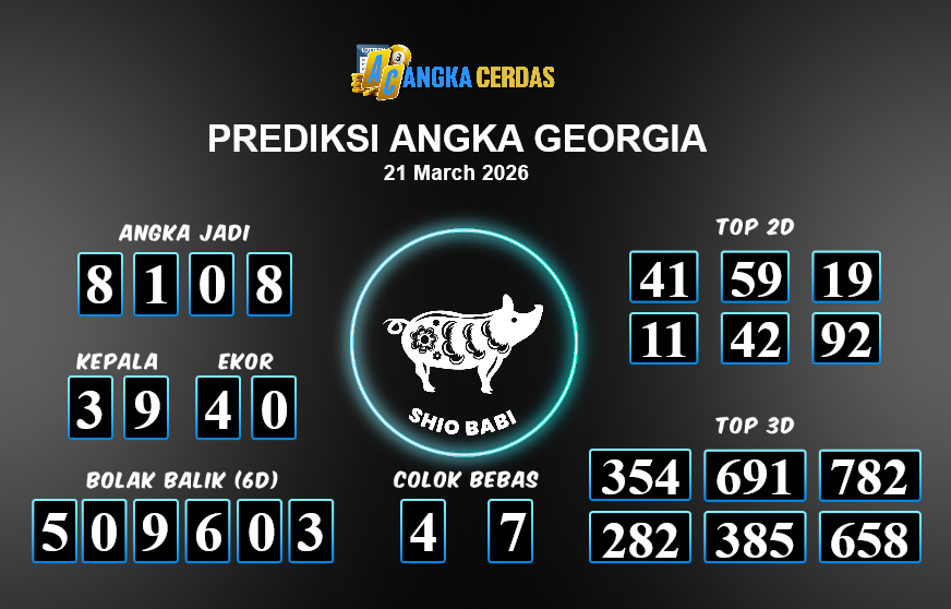 Prediksi Togel GEORGIA untuk hari ini Sabtu, 21 Maret 2026, adalah salah