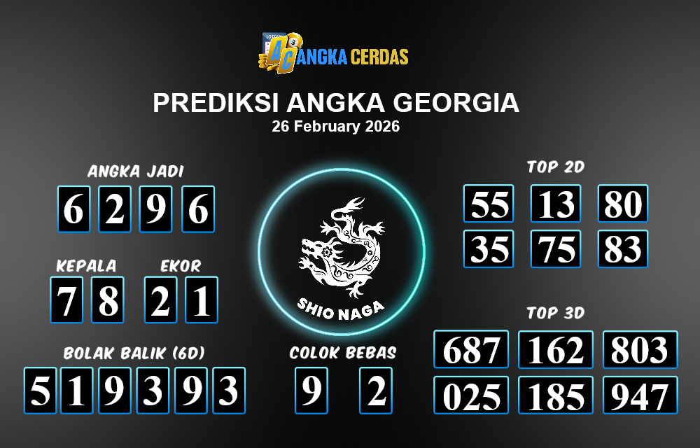 Prediksi Togel GEORGIA untuk hari ini Kamis, 26 Februari 2026, adalah salah