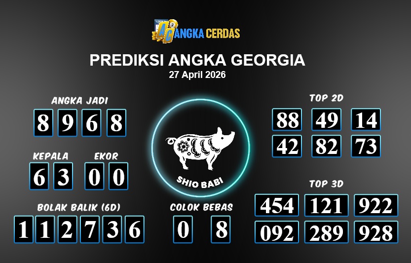 Prediksi Togel GEORGIA untuk hari ini Senin, 27 April 2026, adalah salahsatu jenis togel yang memiliki banyak penggemar.Ini terutama ditujukanbagi Anda yang menyukai 4d/3d/2d. Prediksi Angka Cerdas yang kamisediakan,bisa