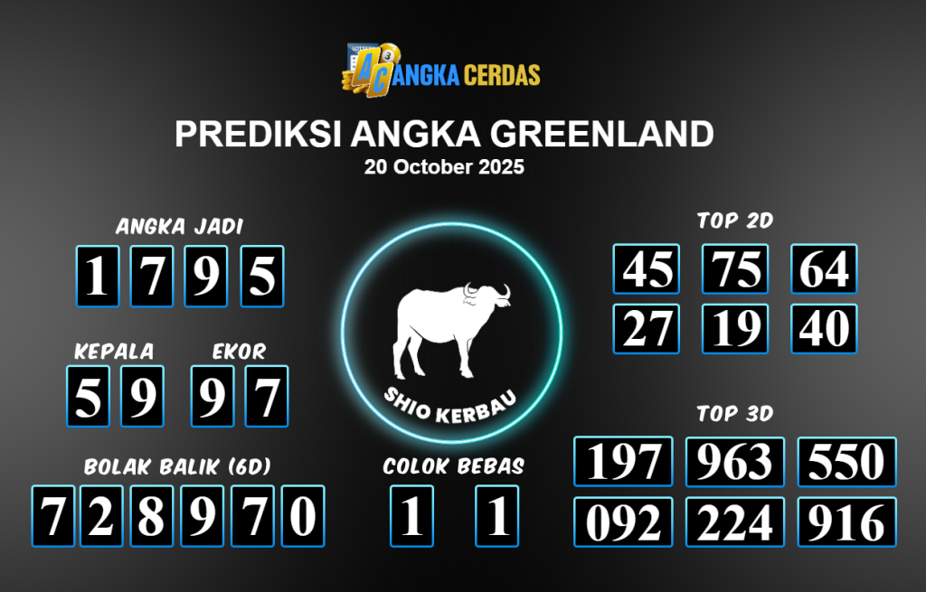 Prediksi Togel GREENLAND untuk hari ini Senin 20 Oktober 2025, adalah salah