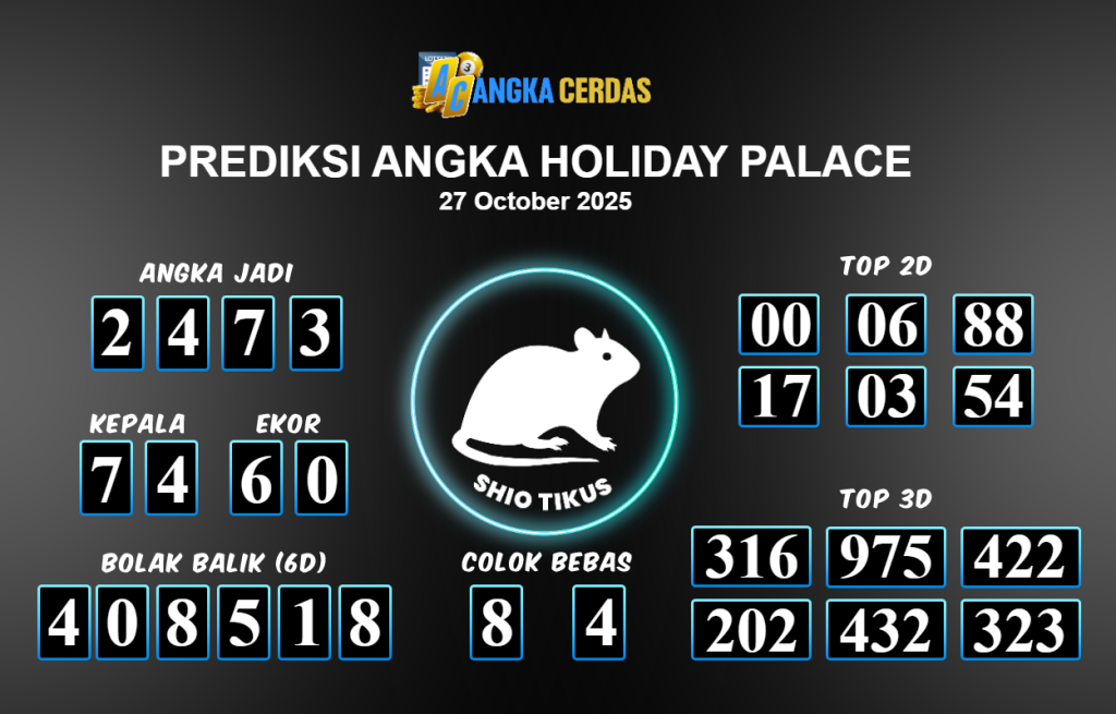 Prediksi Togel HOLIDAY PALACE untuk hari ini Senin 27 Oktober 2025, adalah salah