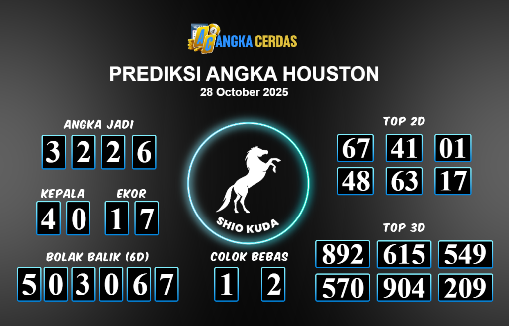 Prediksi Togel HOUSTON untuk hari ini Senin 28 Oktober 2025, adalah salah