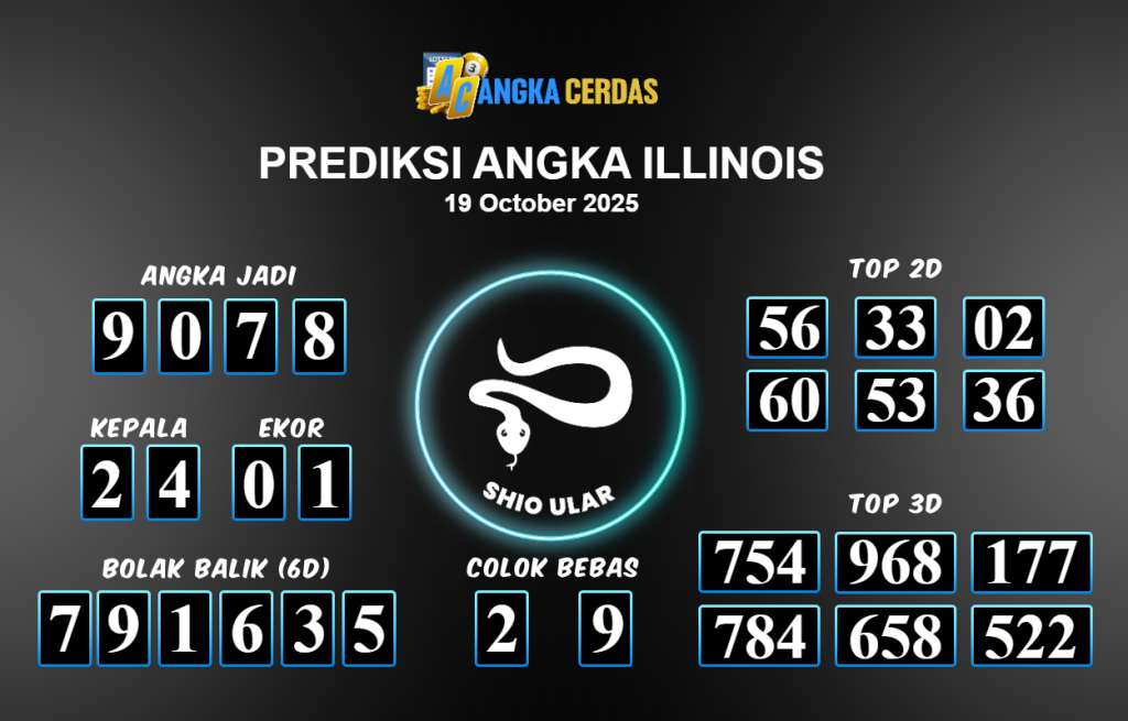 Prediksi Togel ILLINOIS untuk hari ini Minggu 19 Oktober 2025, adalah salah