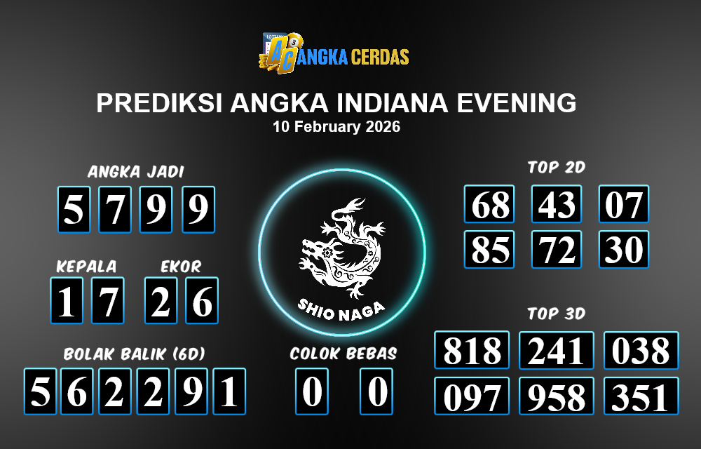 Prediksi Togel INDIANA EVENING untuk hari ini Selasa, 10 Februari 2026, adalah salah