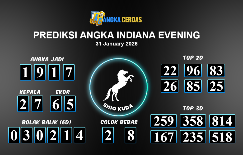 Prediksi Togel INDIANA EVENING untuk hari ini Sabtu 31 Januari 2026,adalah salah